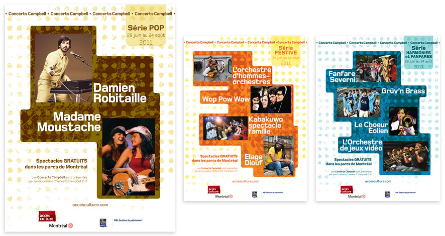 Série d'affiches pour les Concerts Campbell, spectacles dans les parcs de Montréal.